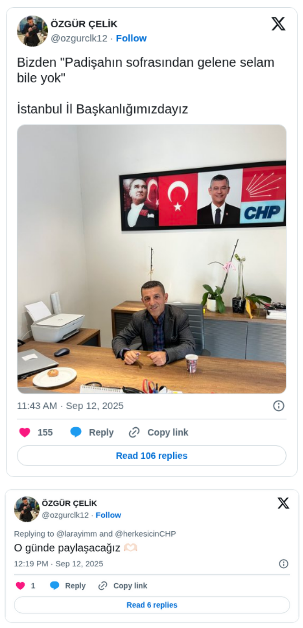 Çelik’in bir kullanıcının CHP Genel Başkanı Özgür Özel’in duvardaki fotoğrafına yönelik paylaşıma verdiği “O gün de paylaşacağız” yanıtı da dikkat çekmişti.