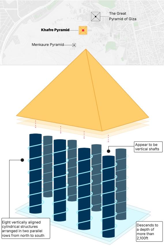 • Yapılan taramalar, üç büyük piramidin ortasındaki Kefren Piramidi’nin tabanından aşağıya doğru uzanan sekiz adet büyük, içi boş silindiri gözler önüne serdi.